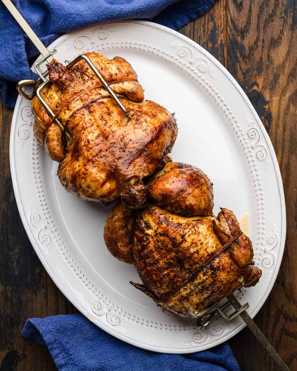Two rotisserie chickens on only fire weber attachement rod on white platter.