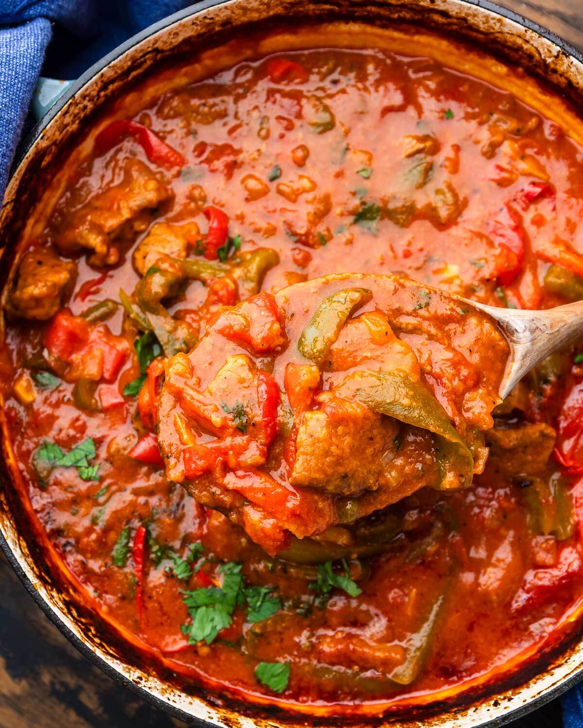 - Once the veal is tender remove the pot from the oven. If there is too much liquid in the pot, place the pot onto a burner and turn to high to reduce and thicken the sauce. If the sauce is too thick, add a 1/2 cup of chicken stock. Tastes test and season with salt and pepper. If needed, add a pinch of sugar to balance out the peppers. Once satisfied, mix in the parsley and serve with rice, pasta, or crusty bread. Enjoy!
